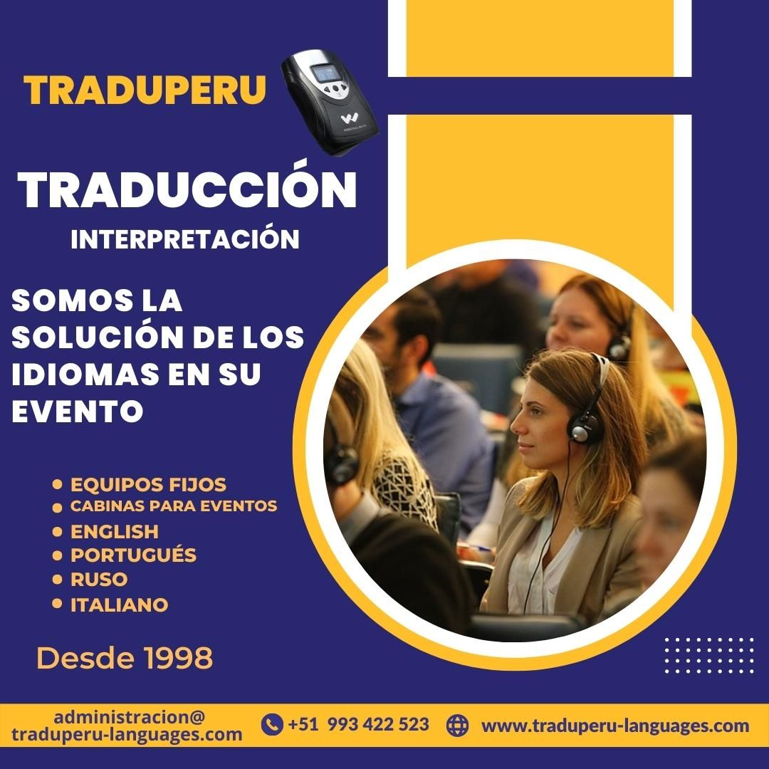 TRADUPERU-LANGUAGES con más de 22 años de experiencia brindando servicio de idiomas y alquiler de equipos para interpretación simultánea, nosotros siempre seremos su aliado con los mejores profesionales en traducción e intérpretes y con lo más alto en calidad en equipos ( William Sound) de interpretación simultánea , perfecto si su matrimonio, eventos, reuniones conferencias, visitas guiadas, entrenamientos y lanzamientos de productos entre otros. Se celebra en un contexto multicultural. Nosotros los ayudaremos a facilitar la comunicación con sus invitados de habla extranjera, permitiendo que todos los asistentes a su evento disfruten de ese gran día.
